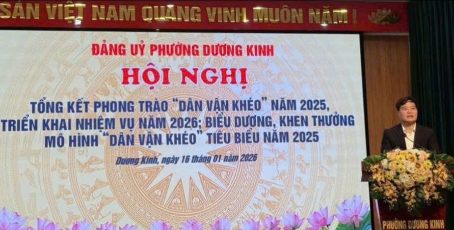 Chiều ngày 16/01/2026, Đảng uỷ phường Dương Kinh tổ chức hội nghị tổng kết phong trào “Dân vận khéo” năm 2025; triển khai nhiệm vụ năm 2026; giao lưu toạ đàm và biểu dương, khen thưởng mô hình tiêu biểu phường năm 2025.