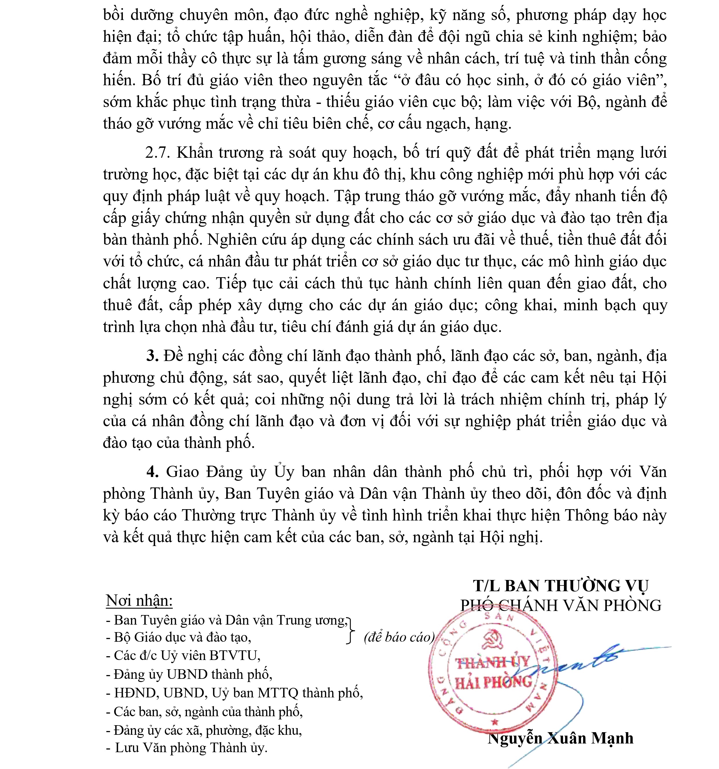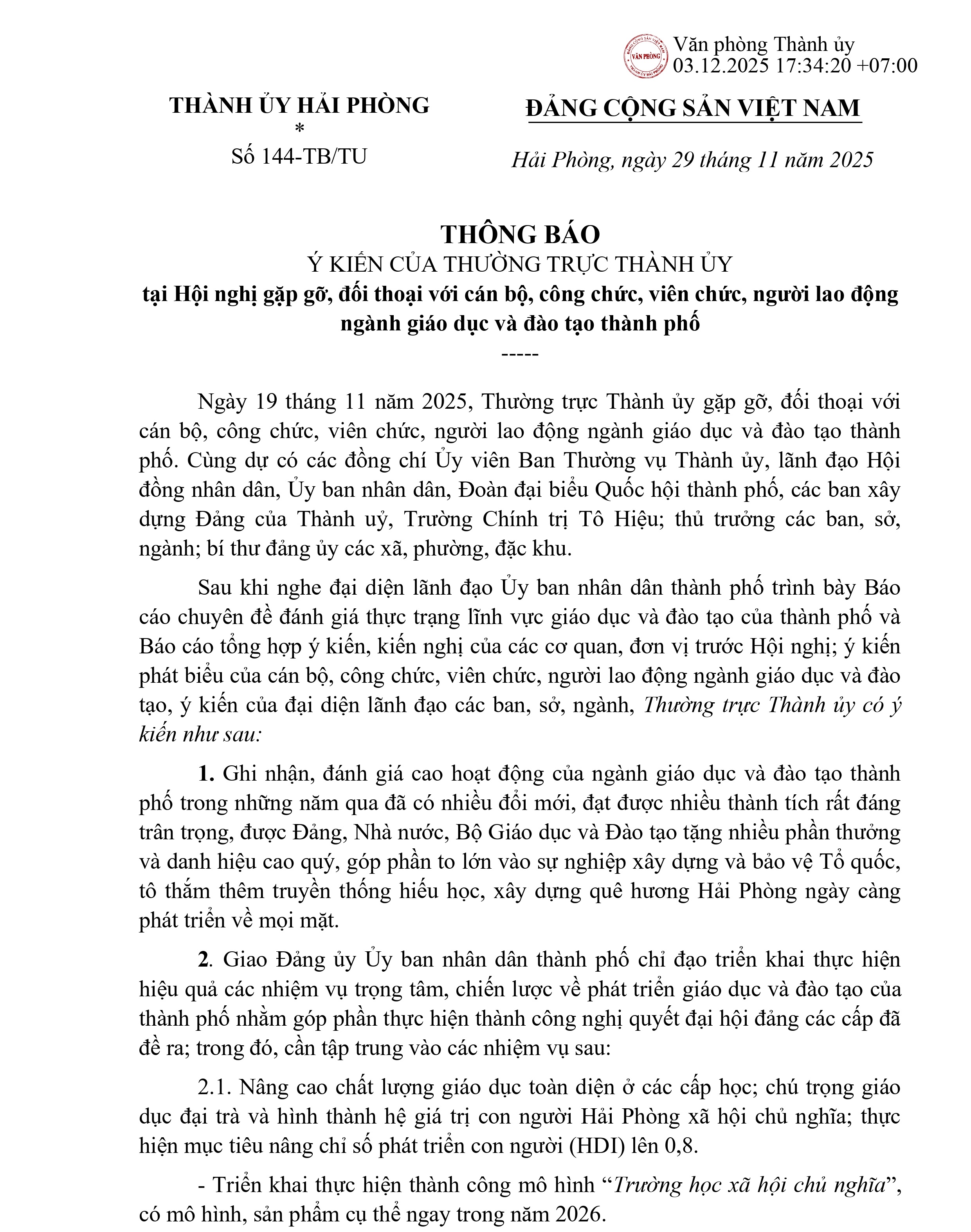 Thông báo ý kiến của Thường trực Thành ủy tại Hội nghị gặp gỡ, đối thoại với cán bộ, công chức, viên chức, người lao động ngành giáo dục và đào tạo thành phố