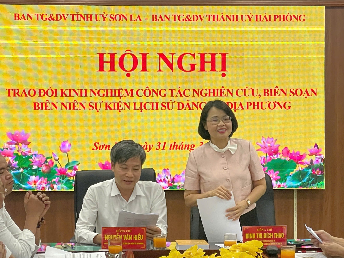 Chiều 31/3/2026, tại tỉnh Sơn La, Ban Tuyên giáo và Dân vận Tỉnh ủy Sơn La và Ban Tuyên giáo và Dân vận Thành ủy Hải Phòng đã phối hợp tổ chức Hội nghị trao đổi kinh nghiệm nghiên cứu, biên soạn lịch sử Đảng bộ địa phương. Chủ trì hội nghị gồm đồng chí Đinh Thị Bích Thảo, Ủy viên Ban Thường vụ, Trưởng ban Tuyên giáo và Dân vận Tỉnh ủy Sơn La và đồng chí Nguyễn Văn Hiểu, Phó Trưởng ban Tuyên giáo và Dân vận Thành ủy Hải Phòng.