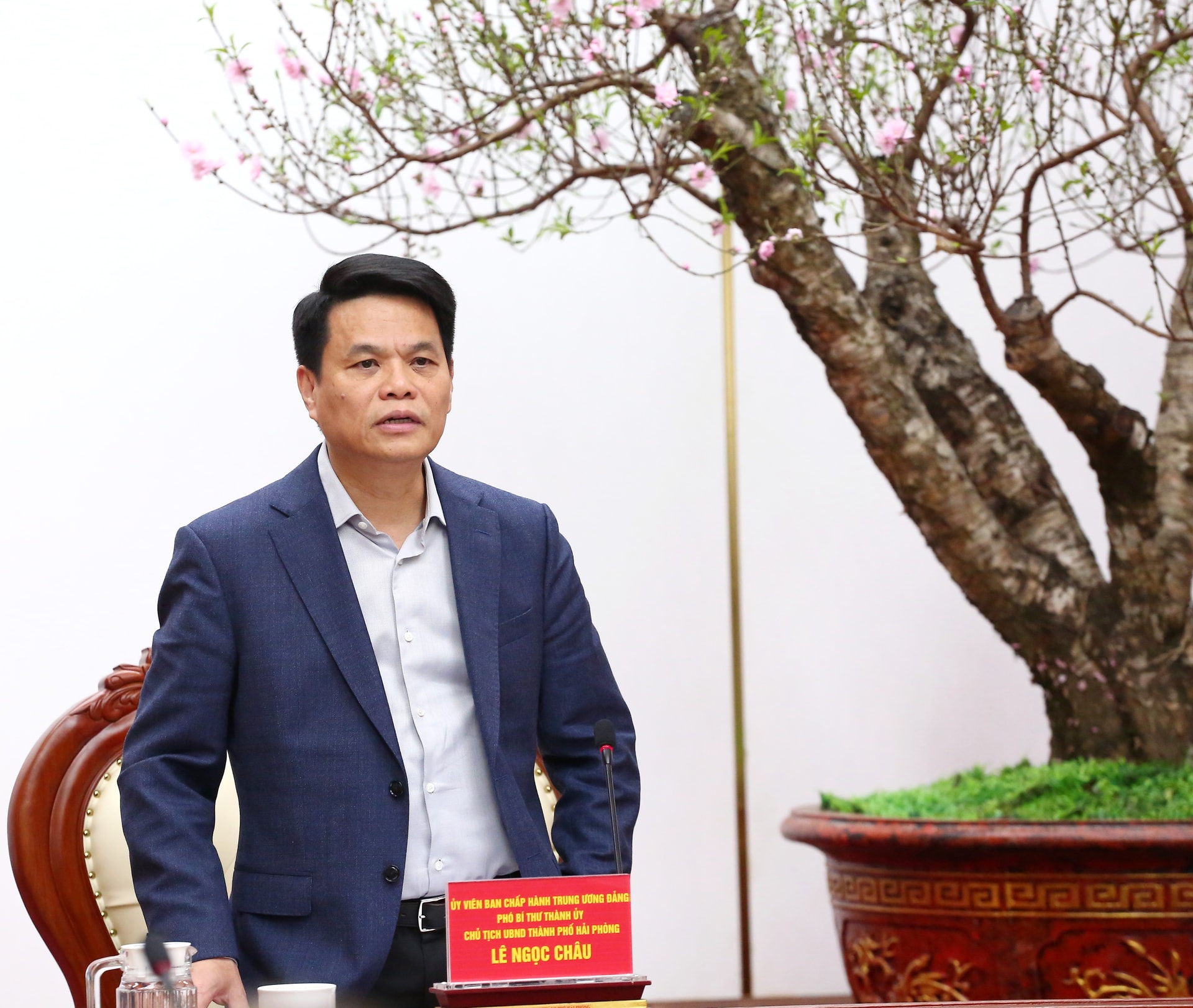 Ủy viên Trung ương Đảng, Chủ tịch UBND Thành phố Hải Phòng Lê Ngọc Châu báo cáo tại cuộc làm việc.