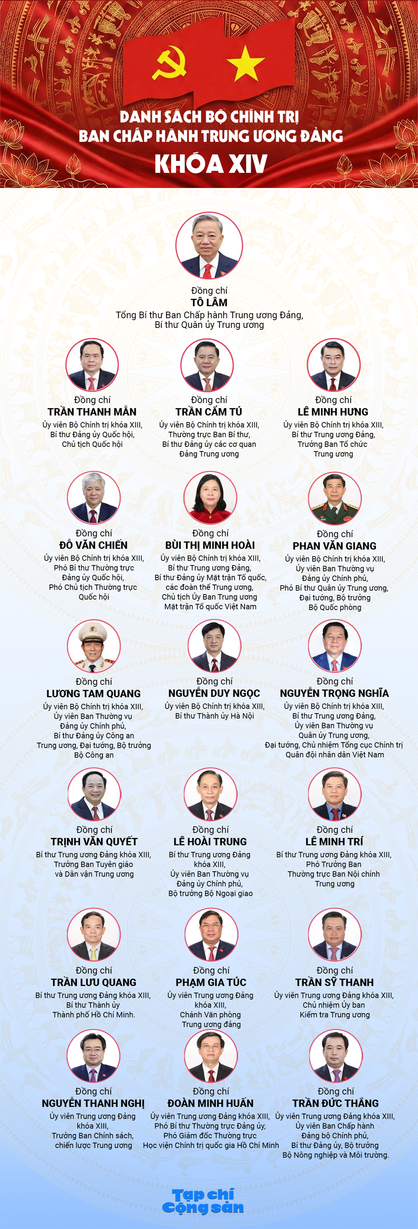Ngày 23-1-2026, tại phiên bế mạc Đại hội đại biểu toàn quốc lần thứ XIV, đồng chí Trần Thanh Mẫn đã thay mặt Đoàn Chủ tịch Đại hội báo cáo kết quả bầu Bộ Chính trị khóa XIV. Theo đó, Ban Chấp hành Trung ương Đảng khóa XIV đã bầu Bộ Chính trị khóa XIV gồm 19 đồng chí: