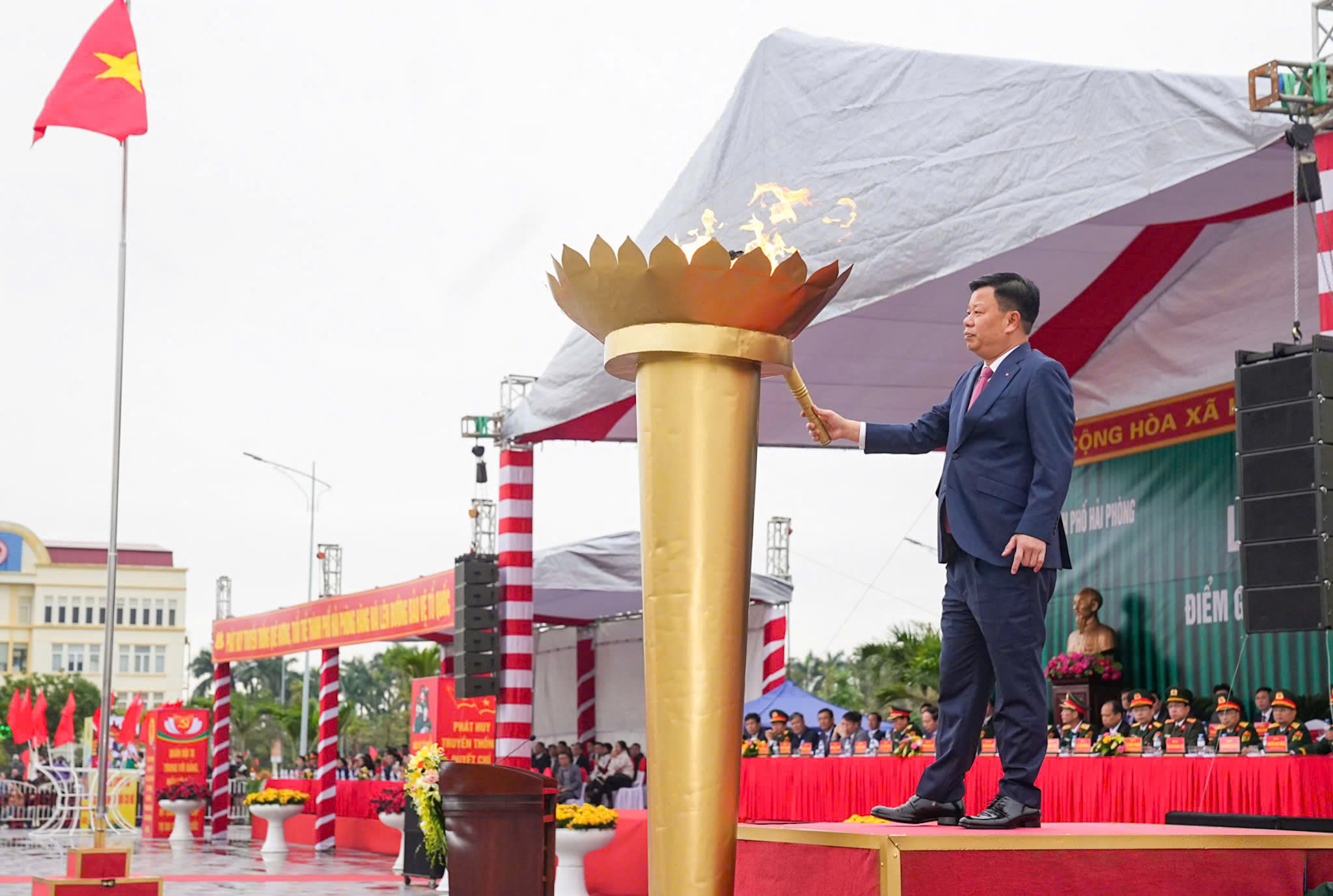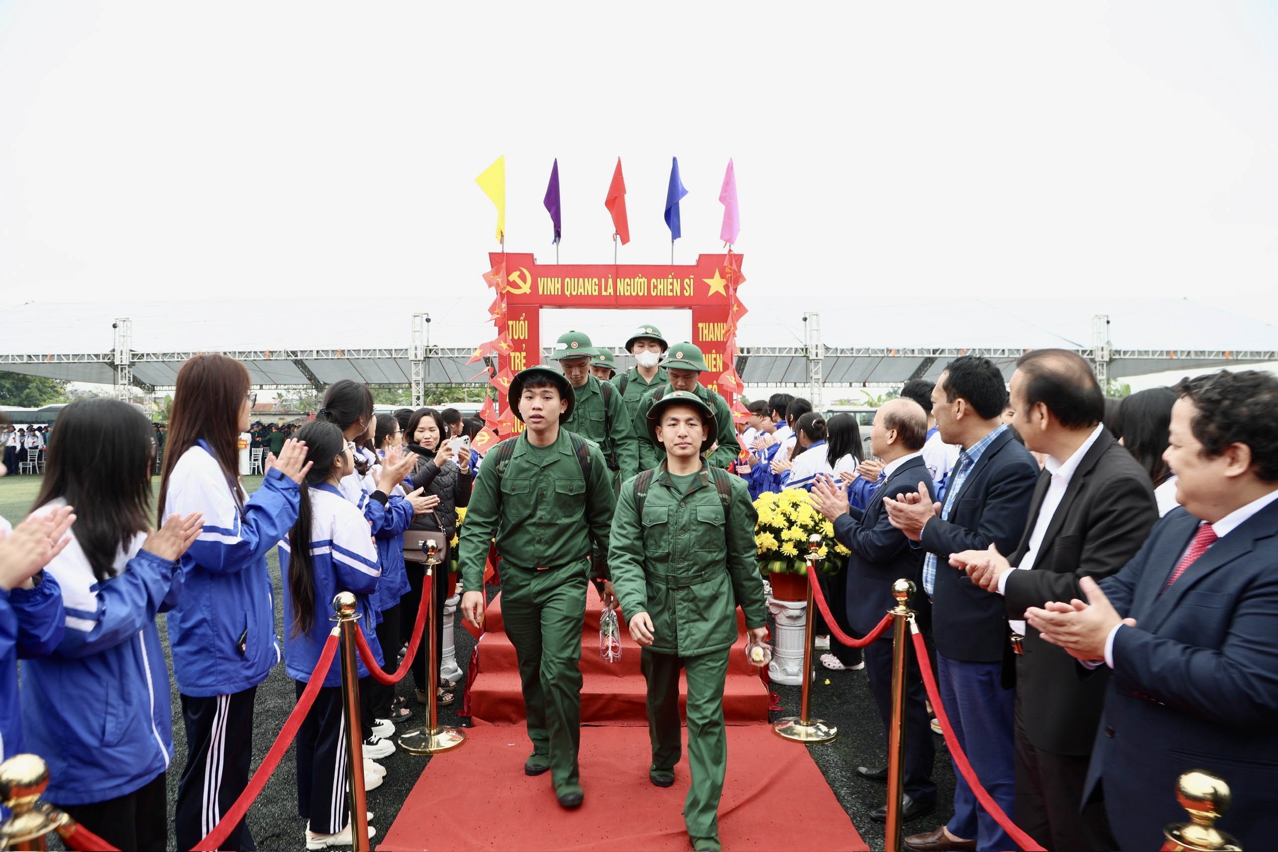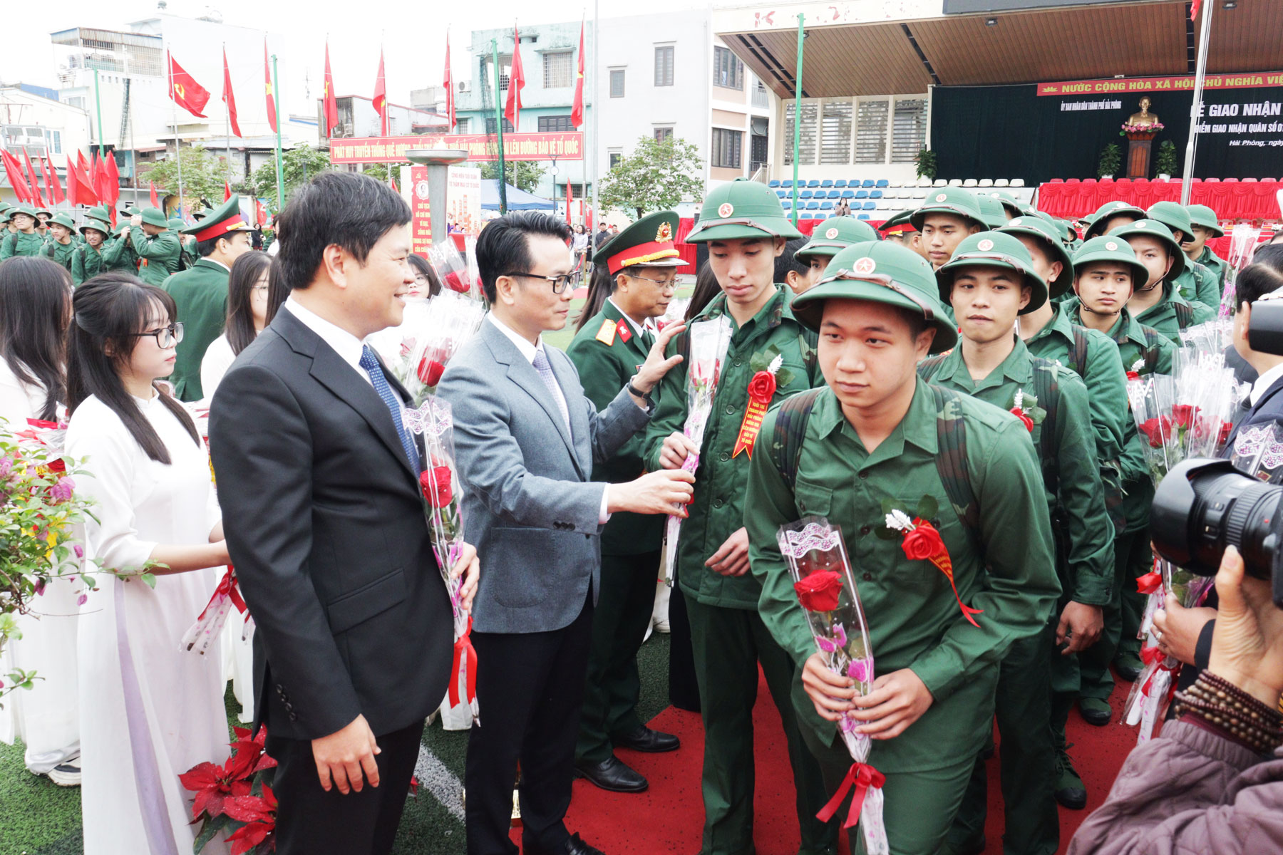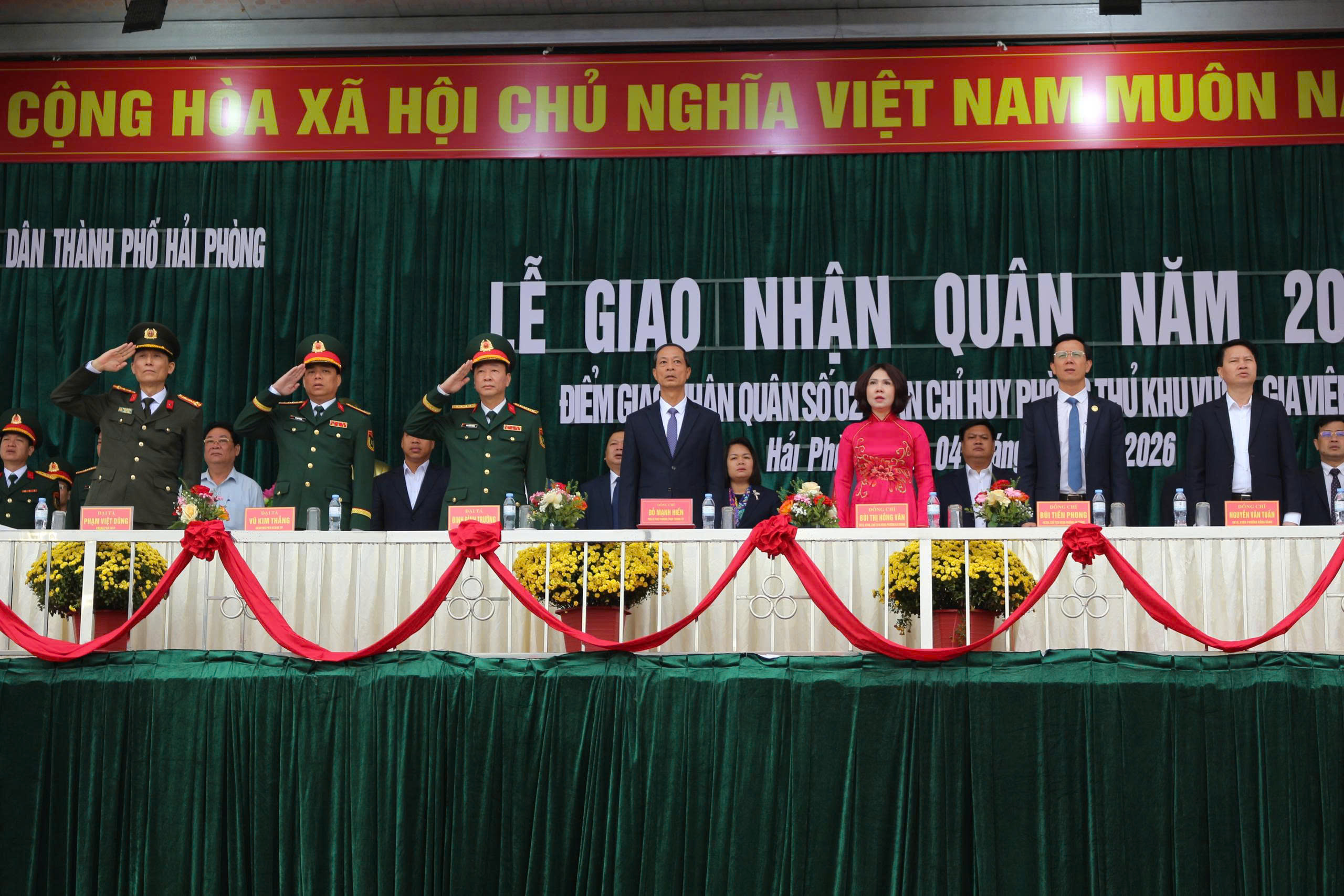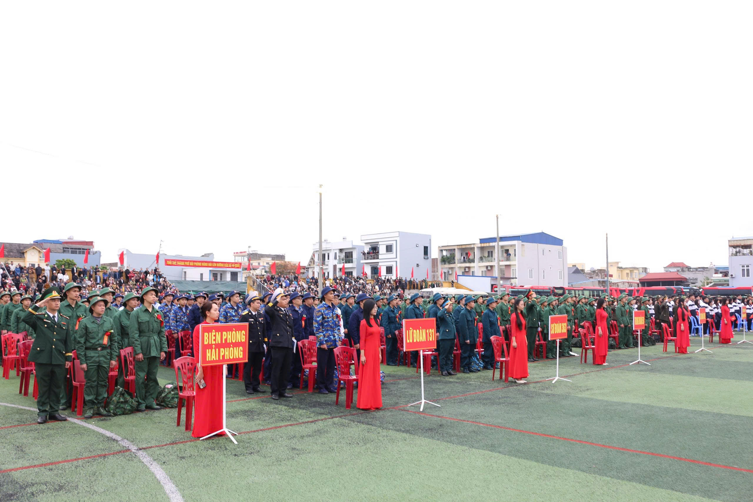 Lãnh đạo thành phố tặng hoa chúc mừng cho các đơn vị nhận quân.Trong không khí trang trọng, hồi trống hội tòng quân vang dội, ngọn lửa truyền thống được thắp sáng, lãnh đạo thành phố và các địa phương đã tặng hoa, quà, gửi lời chúc mừng, động viên các tân binh giữ vững bản lĩnh, phát huy truyền thống quê hương Hải Phòng anh hùng. 585 công dân nhập ngũ đợt này đều bảo đảm đầy đủ tiêu chuẩn về sức khỏe, trình độ văn hóa và phẩm chất chính trị, sẵn sàng nhận và hoàn thành tốt nhiệm vụ được giao.