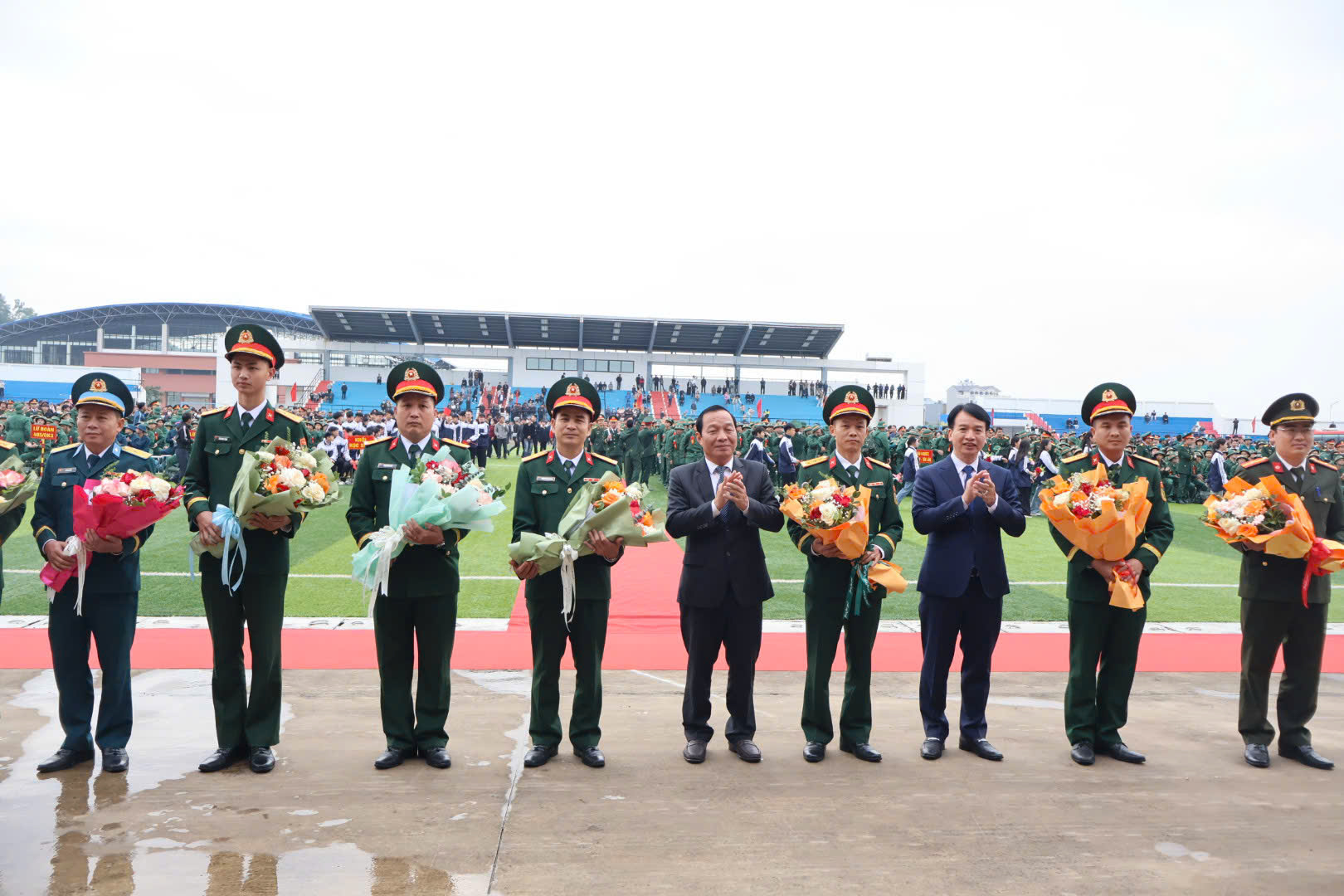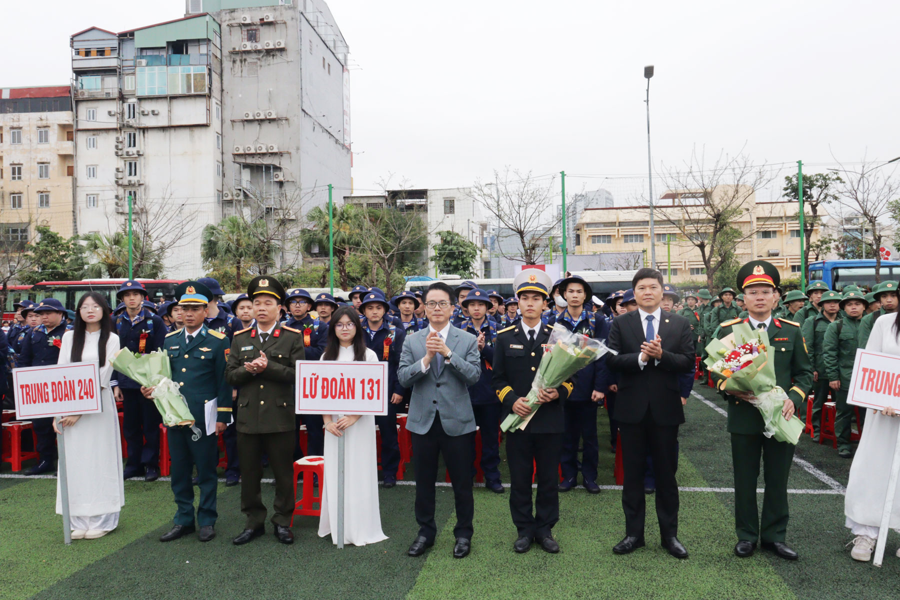 Các đồng chí lãnh đạo thành phố tặng hoa các đơn vị nhận quân.Dự Lễ giao nhận quân có các đồng chí: Thượng tướng Phạm Hoài Nam, Ủy viên Ban Chấp hành Trung ương Đảng, Ủy viên Quân ủy Trung ương, Thứ trưởng Bộ Quốc phòng; Lê Tiến Châu, Ủy viên Trung ương Đảng, Bí thư Thành ủy, Trưởng Đoàn Đại biểu Quốc hội thành phố, Bí thư Đảng ủy Quân sự thành phố; Lê Trung Kiên, Ủy viên Ban Thường vụ Thành ủy, Phó Chủ tịch UBND thành phố; Chu Hồng Hà, Phó Cục trưởng Cục Quân lực, Bộ Tổng tham mưu; Thiếu tướng Nguyễn Đức Dũng, Phó Tư lệnh kiêm Tham mưu trưởng Quân khu 3; cùng đại diện lãnh đạo các Ban, ngành, địa phương liên quan.